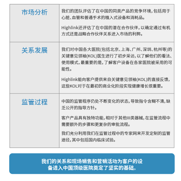 tl_files/aboutus/zh/案例研究配图-15.jpg参与的基本原理:我们曾担任一家美国上市的心血管和普通医疗外科设备制造商和营销商的战略顾问。该客户在美国和欧洲市场拥有长期的成功记录,拥有广泛的FDA和CE标志的产品,但没有进入中国市场。Highlink帮助该客户评估其医疗产品组合的市场潜力,并制定了国家食品药品监管局(SFDA)监管批准的执行计划。
